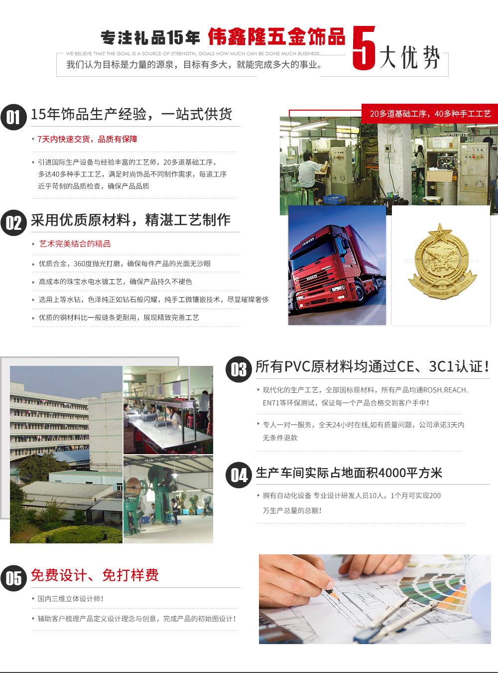 深圳市偉鑫隆五金飾品有限公司位于廣東省深圳市坑梓鎮(zhèn),是一家集設(shè)計、生產(chǎn)、銷售為一體的專業(yè)五金禮品工藝公司。 公司擁有經(jīng)驗豐富的專業(yè)技術(shù)精英團隊,至今已有十多年設(shè)計生產(chǎn)經(jīng)驗。 公司自有工廠引進先進的臺灣設(shè)備及技術(shù),擁有設(shè)計、繪圖、制模、沖壓、壓鑄、拋光、電鍍、包裝等生產(chǎn)流程,可生產(chǎn)銅、鐵、不銹鋼、鋁、鋅合金、鉛錫合金等材質(zhì)的金屬徽章、胸針、胸章、獎?wù)?、獎牌、金屬標牌、工號牌、金屬鑰匙扣、狗牌、軍牌、開瓶器、金屬手機吊飾、錢夾、領(lǐng)帶夾、帽夾、項鏈吊墜、掛包鉤、紀念章、紀念幣、袖扣、促銷禮品鑰匙扣、書簽、五金配件、開瓶器等旅游紀念品及工藝禮品五金飾品。我公司還可根據(jù)客戶樣板開模生產(chǎn)。 公司秉承“精...